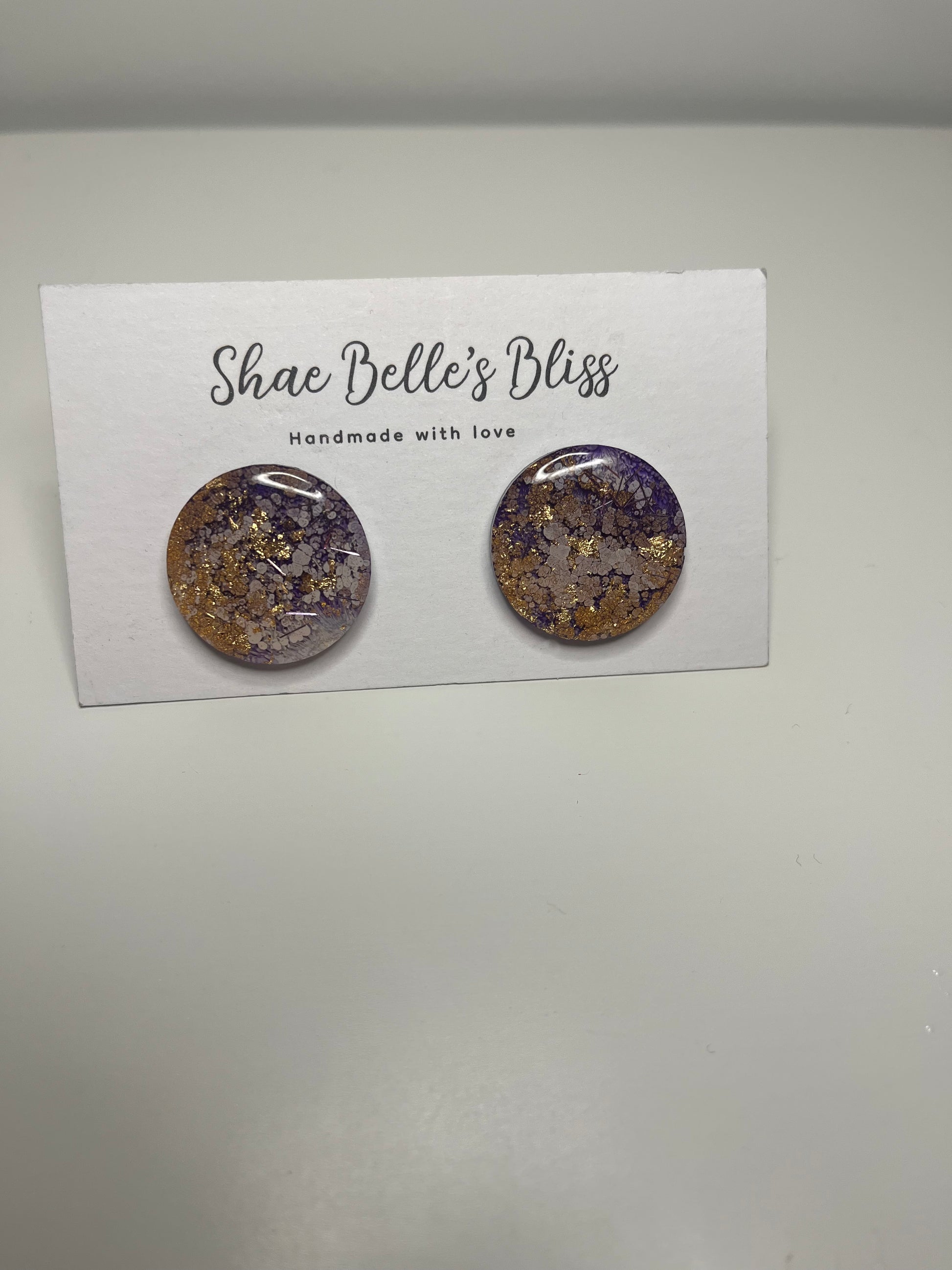 Purple resin with gold flecks and purple glitter, 2.5cm width, surgical steel posts