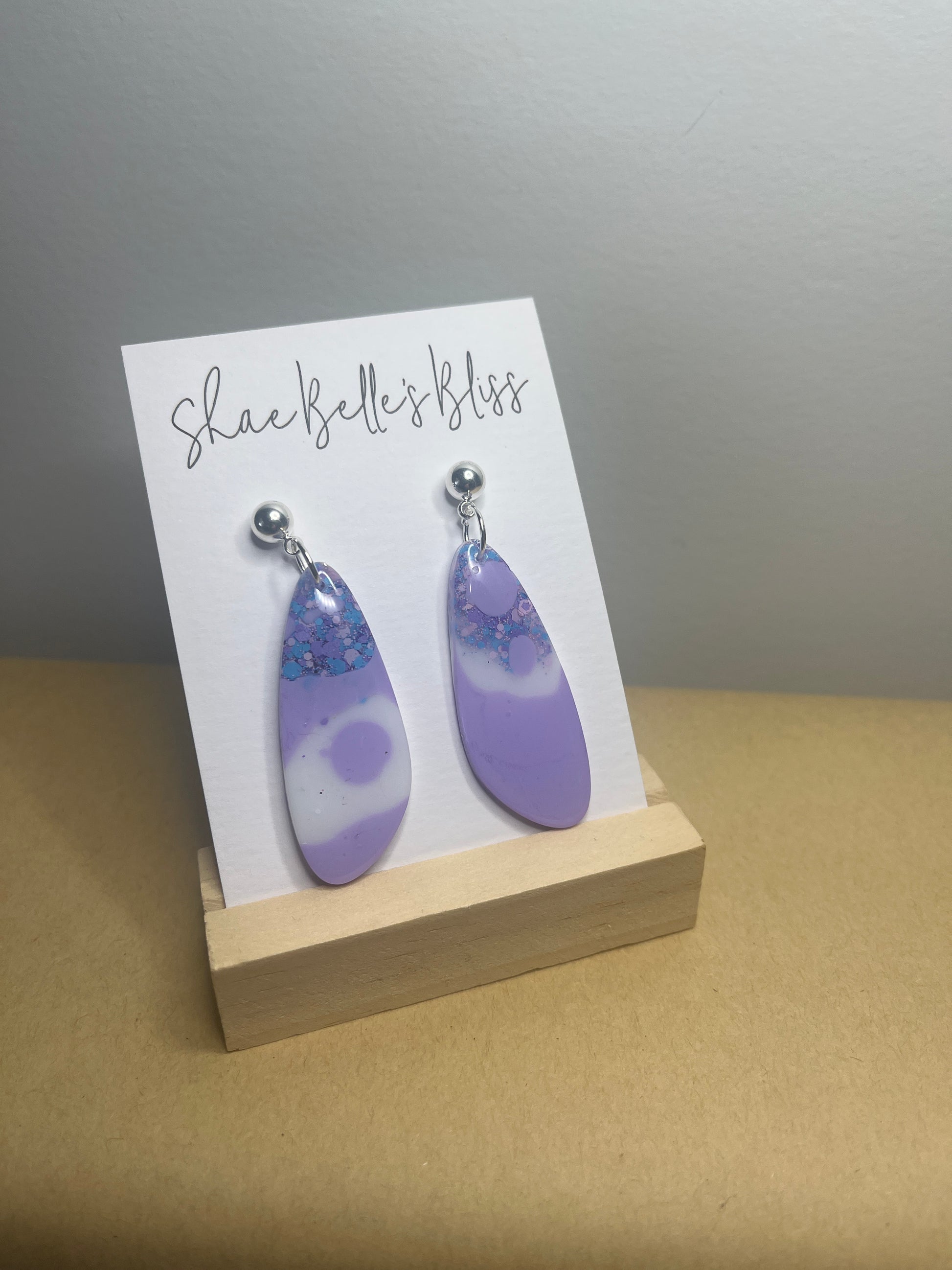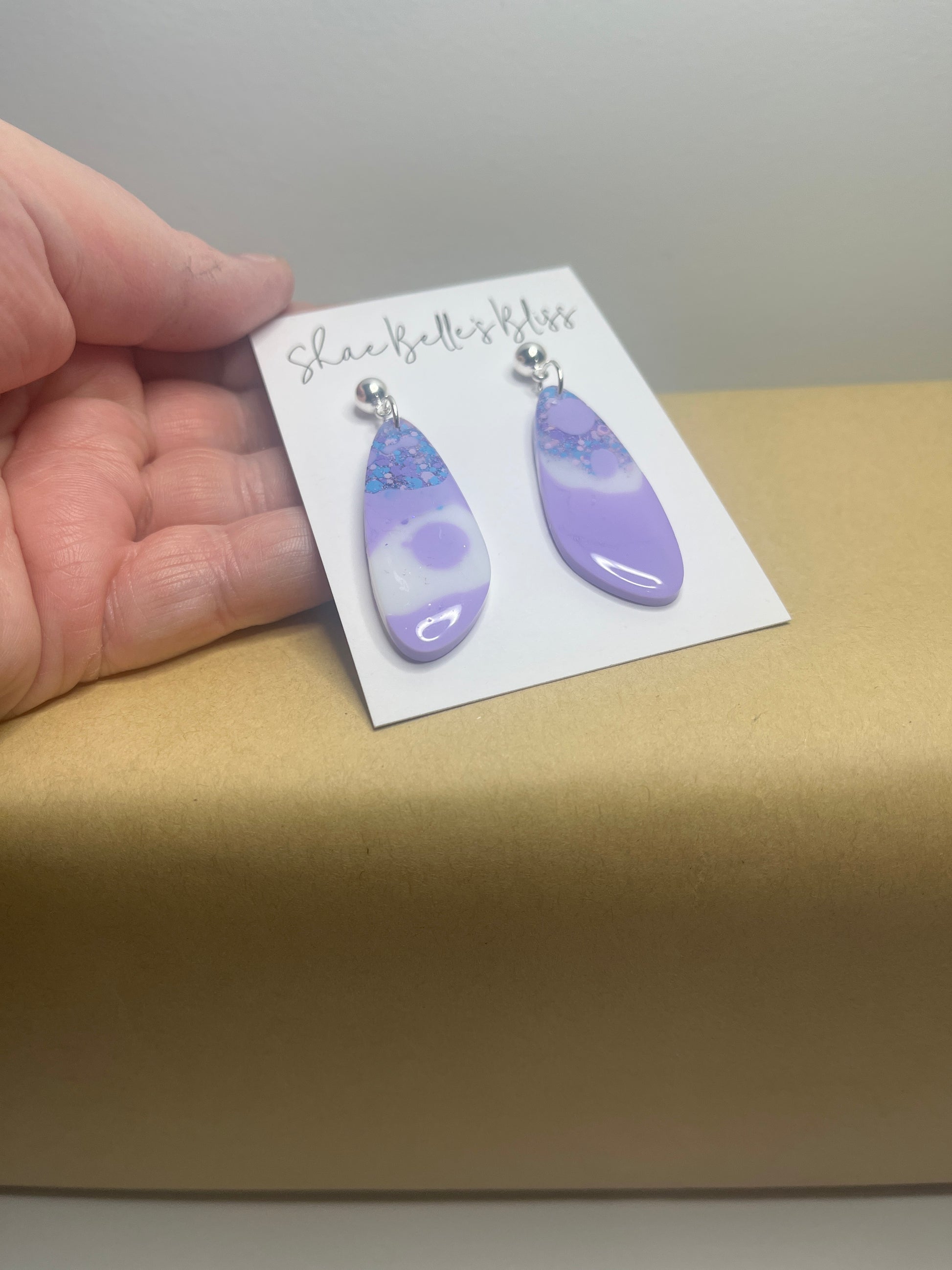 Paddle shaped dangle, approx 5-6cm, lavender, white and pale blue tones