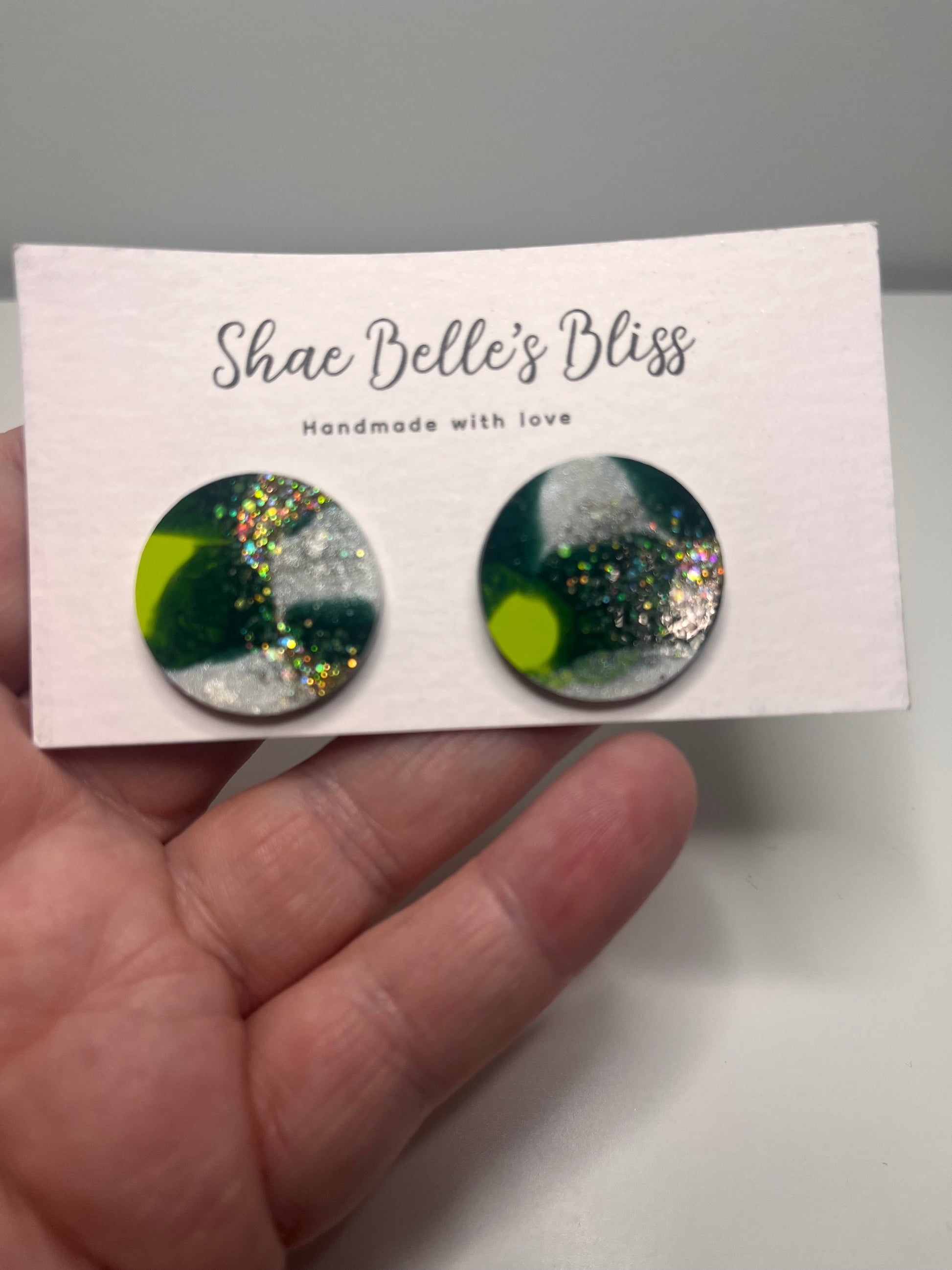 Green resin with gold and silver flecks, 2.5cm width, surgical steel posts