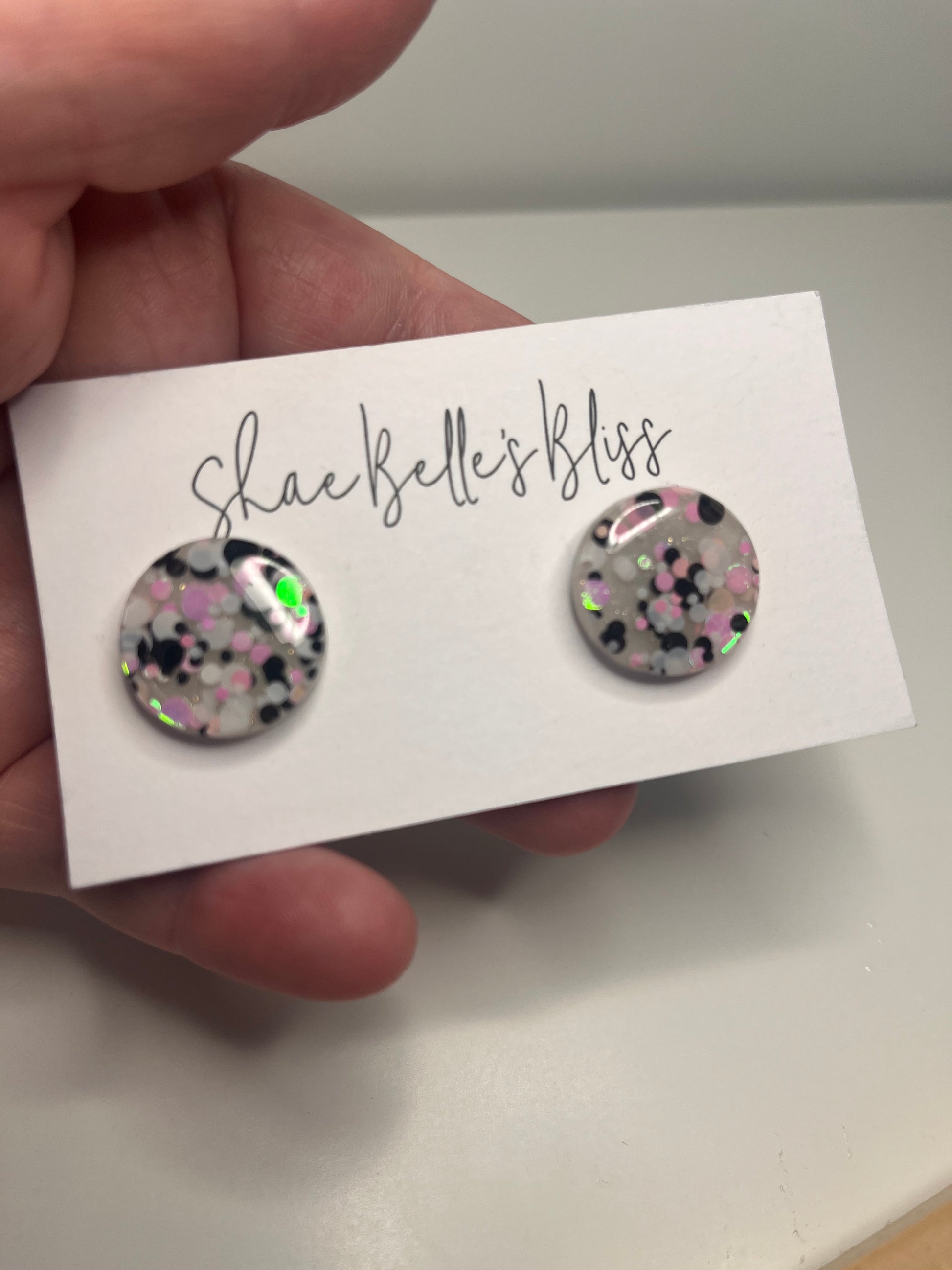 White resin and glitter speckled with black glitter, 2cm width, surgical steel posts
